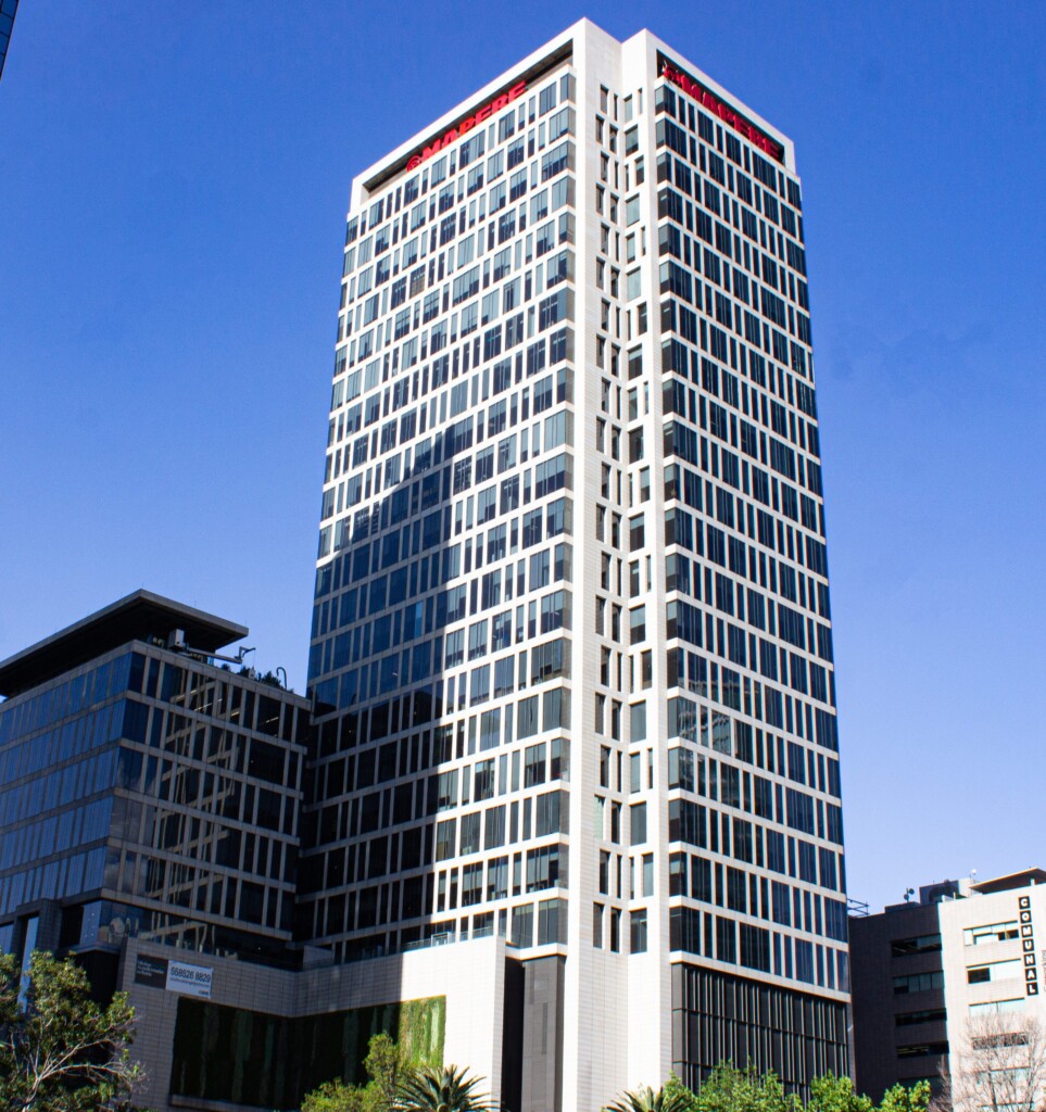 Edificio corporativo de oficinas con 20 niveles de oficina, 3 locales comerciales y 22 niveles de estacionamientos.